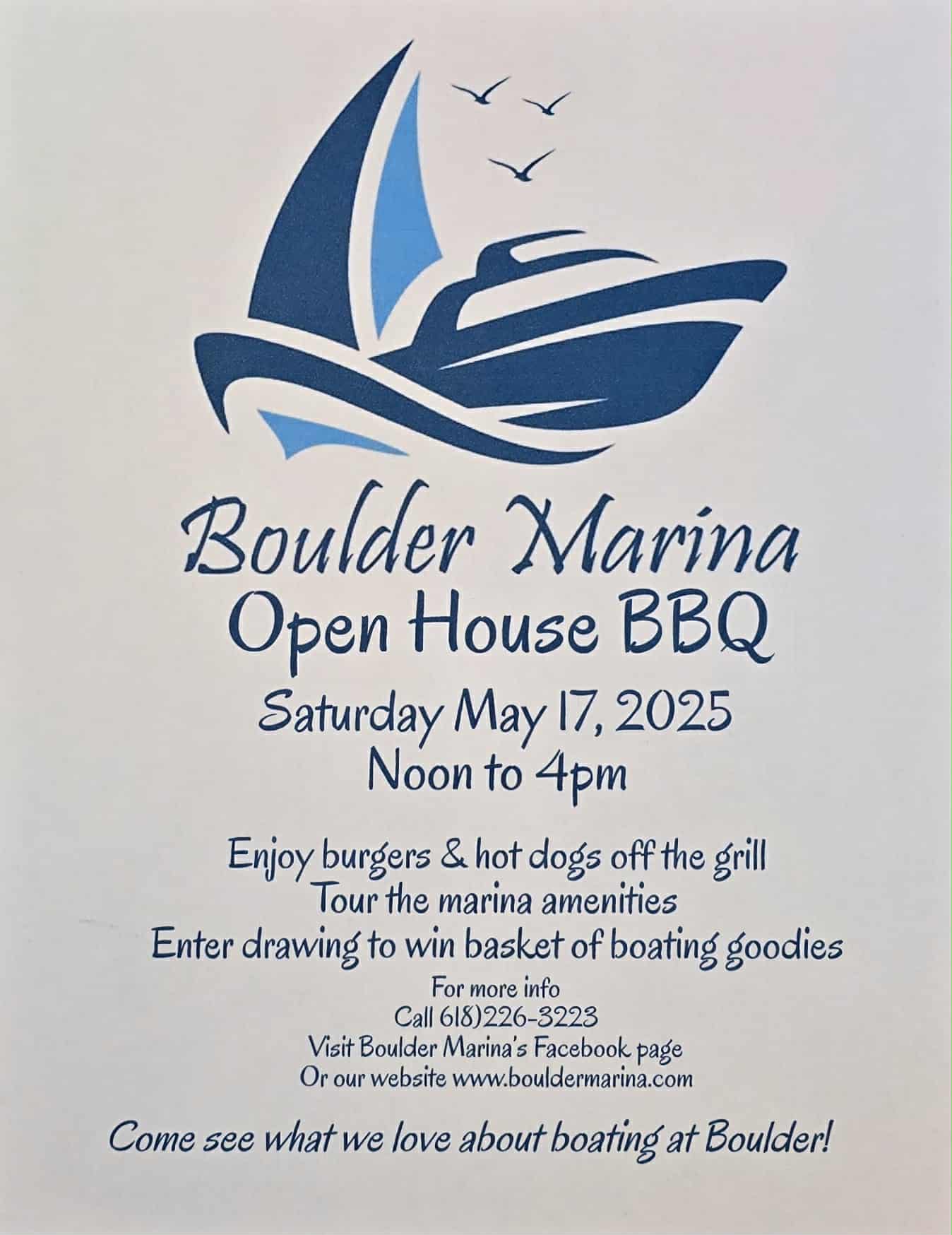 « All EventsThis event has passed.Boulder Marina Open House and BBQMay 17, 2025 @ 12:00 pm - 4:00 pm« Pot Luck SupperCruiser Cup #1 – (CYC Sponsored Lakewide event) » Add to calendar Google Calendar iCalendar Outlook 365 Outlook Live Details Date: May 17, 2025 Time: 12:00 pm - 4:00 pm Event Category: Marina Event Venue Boulder Marina 26000 County Rd 1850 N Shattuc, IL 62231 United States + Google Map
