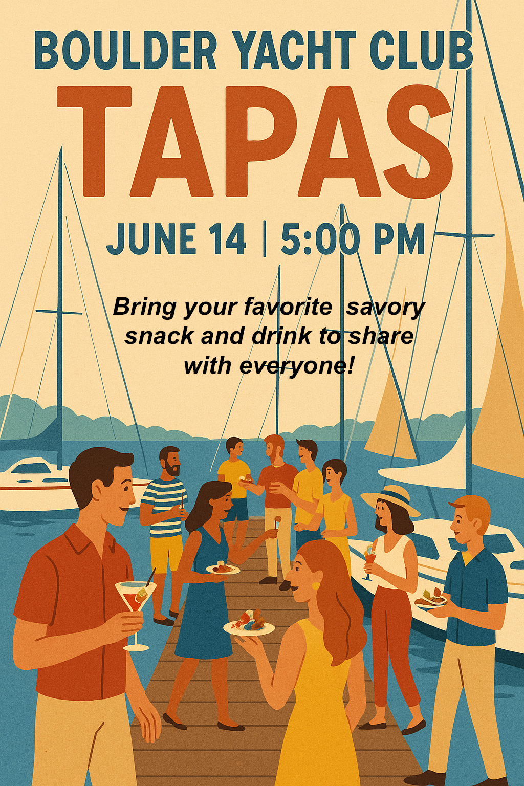 FreeBring your favorite snack and a paired drink to share and set it up at your dock box or on your boat. We’ll all stroll from boat to boat for great conversations and exchange ripping yarns!